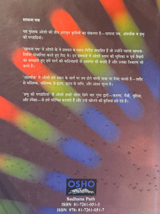यह पुस्तक ओशो की तीन अद्भुत कृतियों का संकलन है—साधना पथ, अंतर्यात्रा व प्रभु की पगडंडियां। 'साधना पथ' में ओशो के वे प्रवचन व ध्यान-निर्देश समाहित हैं जो उन्होंने पहला साधना-शिविर संचालित करते हुए दिए थे।